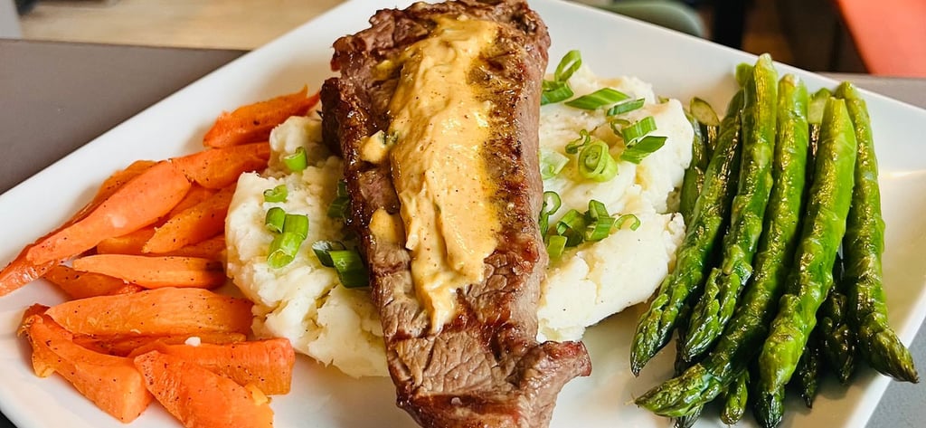 Chicken Dinner … Roasted and tender, served with vegetables, and french fries or sweet potato mash.