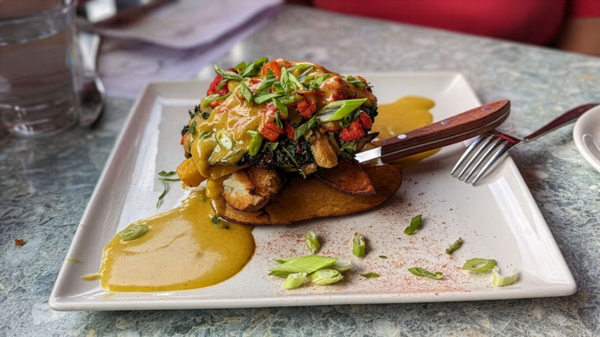 Vegan Smashed Potato $15 Vegan poutine! Fried smashed potato, plant-based sausage, green onions, mushrooms, tomato, spices, vegan hollandaise sauce, vegan mozzarella cheese.