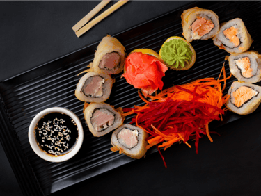 Inside out roll with fried king prawns, avocado, Japanese omelet and cream cheese.